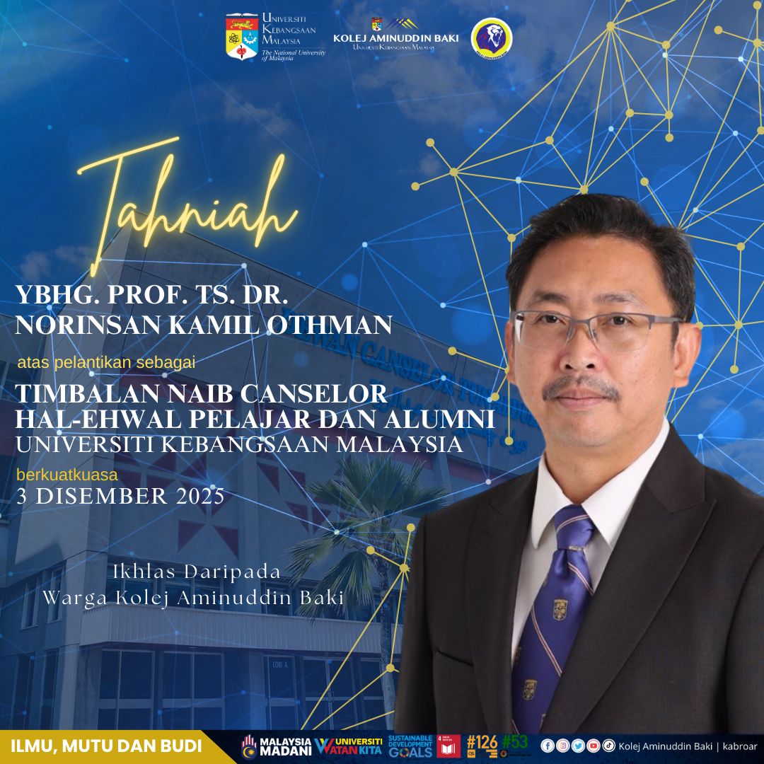 Jutaan tahniah di atas pelantikan YBhg. Prof. Ts. Dr. Norinsan Kamil Othman sebagai Timbalan Naib Canselor Hal-Ehwal Pelajar dan Alumni Universiti Kebangsaan Malaysia. Semoga amanah dan tanggungjawab ini dapat dijalankan dengan penuh dedikasi..