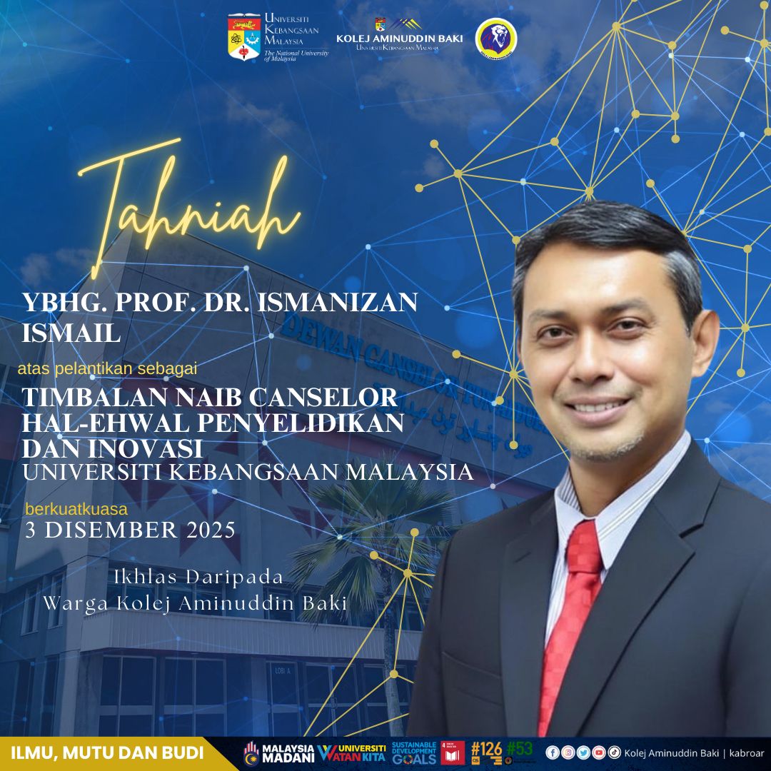 Jutaan tahniah di atas pelantikan YBhg. Prof. Dr. Ismanizan Ismail sebagai Timbalan Naib Canselor Hal-Ehwal Penyelidikan dan Inovasi Universiti Kebangsaan Malaysia. Semoga amanah dan tanggungjawab ini dapat dijalankan dengan penuh dedikasi.