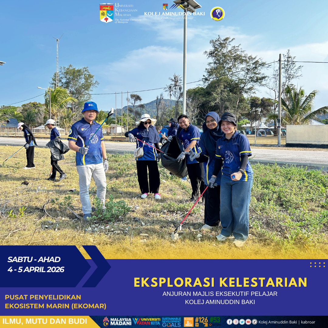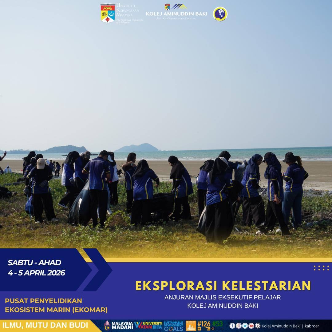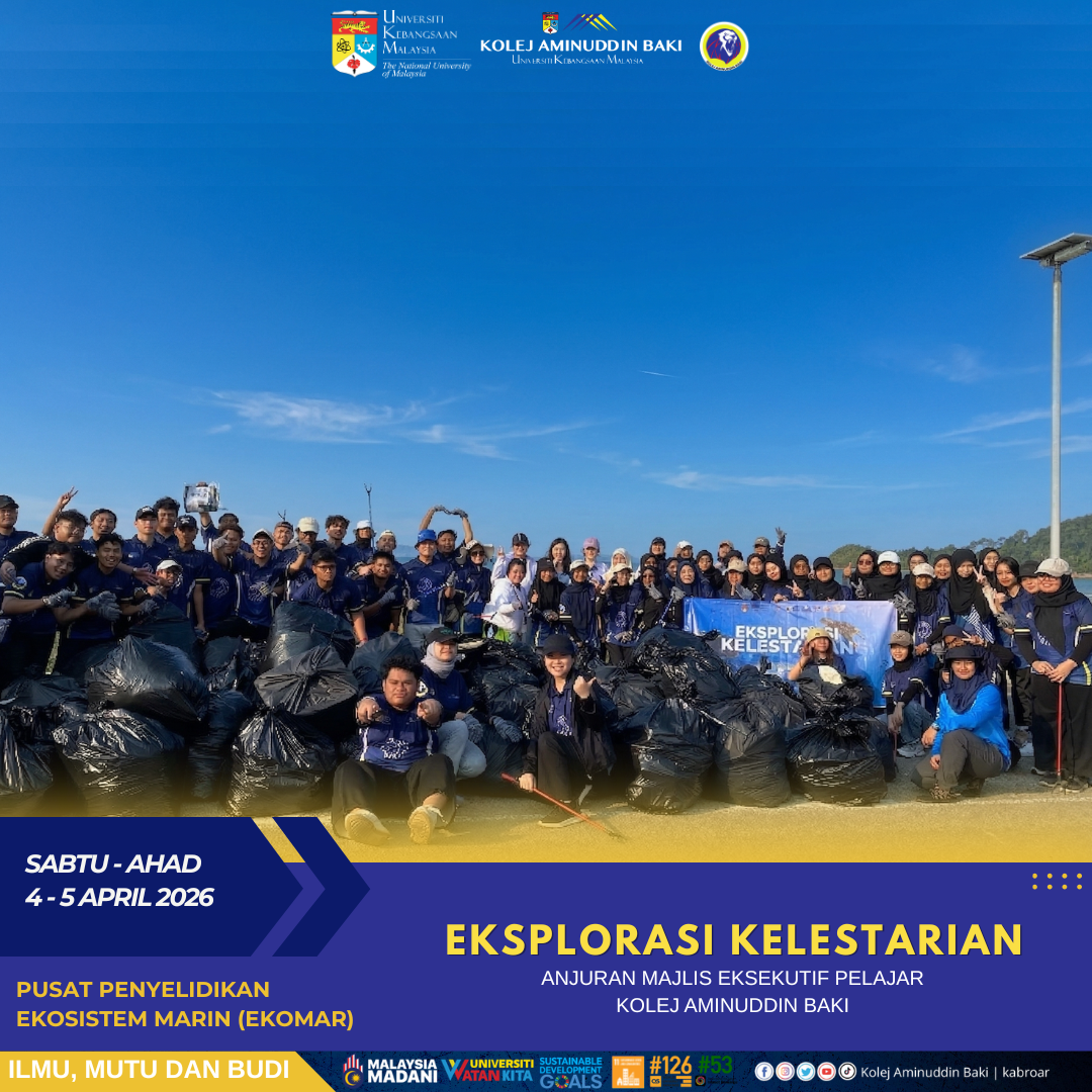 Kolej Aminuddin Baki (KAB) dengan kerjasama Pusat Penyelidikan Ekosistem Marin (EKOMAR), UKM telah berjaya menganjurkan program Eksplorasi Kelestarian 2026 pada 4-5 April 2026 berteampat di EKOMAR, Mersing. Program ini bertujuan meningkatkan kesedaran pelajar terhadap kepentingan pemeliharaan alam sekitar serta kelestarian ekosistem, di samping memupuk semangat kesukarelawanan dalam kalangan mahasiswa melalui khidmat kepada komuniti setempat.
