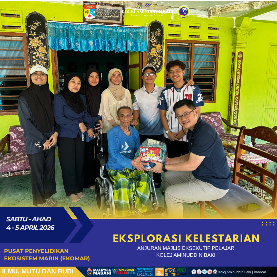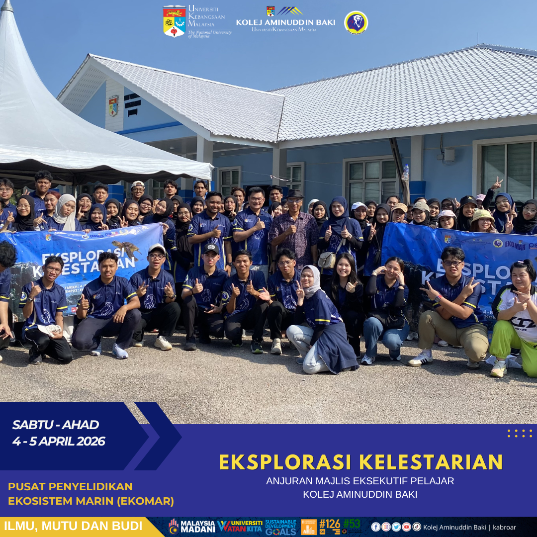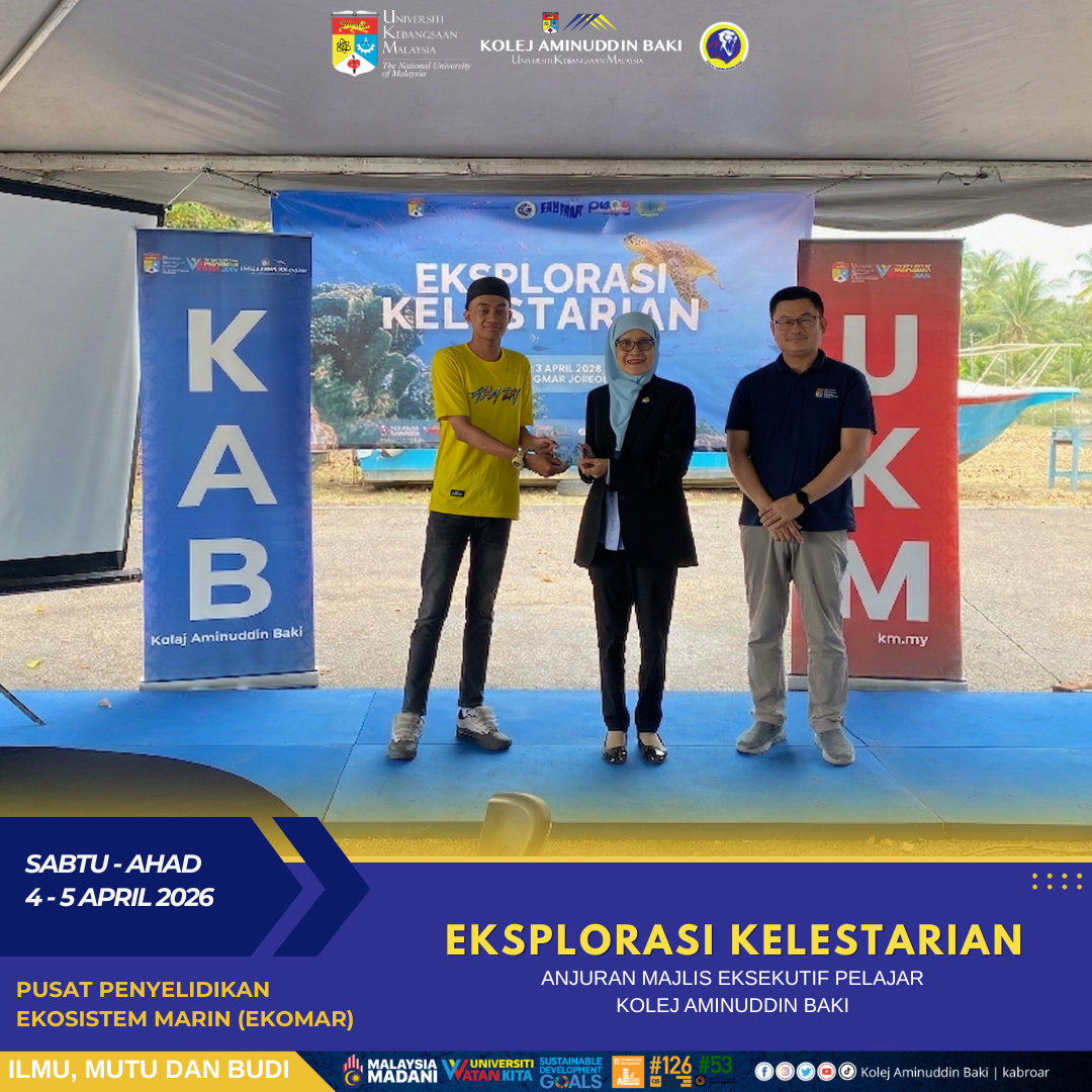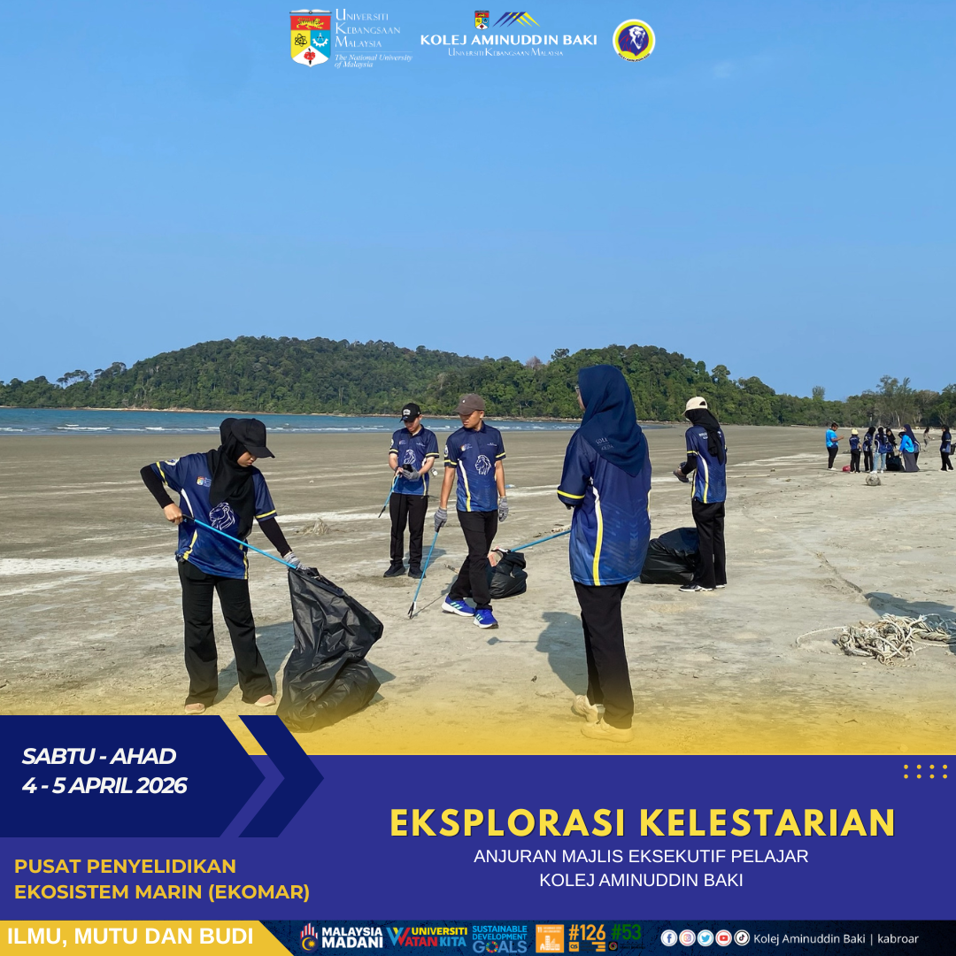 Kolej Aminuddin Baki (KAB) dengan kerjasama Pusat Penyelidikan Ekosistem Marin (EKOMAR), UKM telah berjaya menganjurkan program Eksplorasi Kelestarian 2026 pada 4-5 April 2026 berteampat di EKOMAR, Mersing. Program ini bertujuan meningkatkan kesedaran pelajar terhadap kepentingan pemeliharaan alam sekitar serta kelestarian ekosistem, di samping memupuk semangat kesukarelawanan dalam kalangan mahasiswa melalui khidmat kepada komuniti setempat.