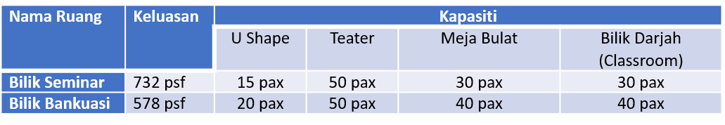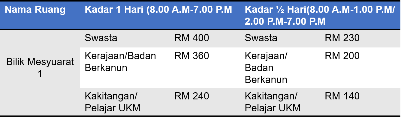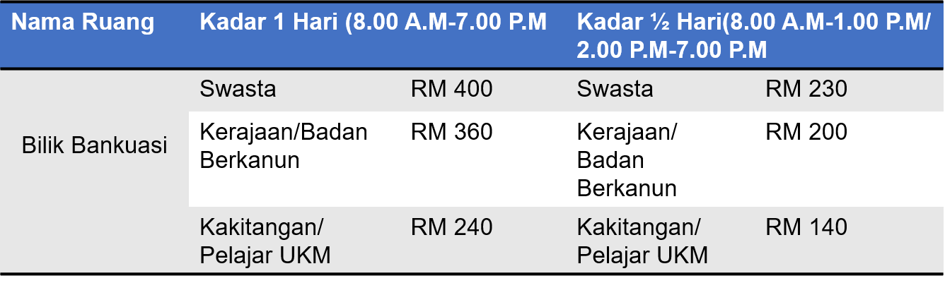Tempahan Ruang PENYEWAAN BILIK SEMINARRuang Selesa & Lengkap untuk Acara Profesional Anda Kami menyediakan kemudahan bilik seminar yang selesa bagi memenuhi keperluan mesyuarat, bengkel, kursus, latihan serta pelbagai program profesional. Setiap bilik seminar dilengkapi dengan: Sistem audio dan mikrofonSambungan internet (Wi-Fi)Penghawa dinginMeja dan kerusi yang selesa Kesesuaian PenggunaanBilik seminar kami sesuai digunakan oleh: Staf/pelajar UKMSyarikat swastaInstitusi pendidikanPenganjur kursus dan latihanMesyuarat dalaman dan program komuniti Kadar Sewaan Kadar sewaan bilik seminar adalah bergantung kepada: Saiz dan kapasiti bilikTempoh penggunaanKeperluan kemudahan tambahanSila hubungi kami untuk mendapatkan maklumat lanjut mengenai pakej dan kadar sewaan. Hubungi Kami untuk tempahan dan pertanyaan03-89215104kab@ukm.edu.my