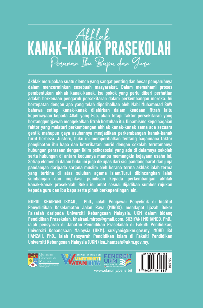 Morality is a crucial element with a profound influence in reflecting a society. In understanding the process of moral development in children, the key issue that requires attention is the influence of the environment on their growth. This aligns with what was described by Prophet Muhammad (PBUH), who stated that every child is born in a state of fitrah, which is an innate belief in the One God, yet it is the surrounding environment that plays a role in maintaining this natural disposition towards faith. The dynamic interplay of various factors shaping children’s moral development, whether genetic or through parenting styles, leads to differences in their growth. Therefore, this book explores how parental involvement and students’ attachment to school, particularly their emotional connection to the school’s psychosocial climate and the interaction between these two aspects, can drive the success of this effort. Each element in this book is examined from both Western perspectives and the views of Muslim scholars because the term morality is a concept built upon the foundation of Islamic teachings. Also discussed are the contributions and implications of this writing on the moral development of preschool children. This book is highly suitable as a reference for teachers, parents and other relevant stakeholders.