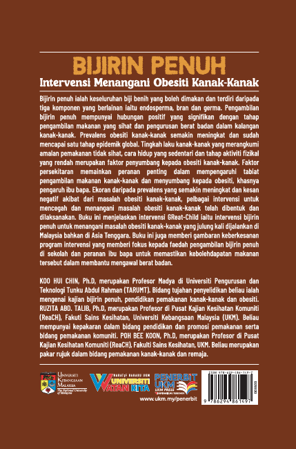 Bijirin penuh ialah keseluruhan biji benih yang boleh dimakan dan terdiri daripada tiga komponen yang berlainan iaitu endosperma, bran dan germa. Pengambilan bijirin penuh mempunyai hubungan positif yang signifikan dengan tahap pengambilan makanan yang sihat dan pengurusan berat badan dalam kalangan kanak-kanak. Prevalens obesiti kanak-kanak semakin meningkat dan sudah mencapai satu tahap epidemik global. Tingkah laku kanak-kanak yang merangkumi amalan pemakanan tidak sihat, cara hidup yang sedentari dan tahap aktiviti fizikal yang rendah merupakan faktor penyumbang kepada obesiti kanak-kanak. Faktor persekitaran memainkan peranan penting dalam mempengaruhi tabiat pengambilan makanan kanak-kanak dan menyumbang kepada obesiti, khasnya pengaruh ibu bapa. Ekoran daripada prevalens yang semakin meningkat dan kesan negatif akibat dari masalah obesiti kanak-kanak, pelbagai intervensi untuk mencegah dan menangani masalah obesiti kanak-kanak telah dibentuk dan dilaksanakan. Buku ini menjelaskan intervensi GReat-Child iaitu intervensi bijirin penuh untuk menangani masalah obesiti kanak-kanak yang julung kali dijalankan di Malaysia bahkan di Asia Tenggara. Buku ini juga memberi gambaran keberkesanan program intervensi yang memberi fokus kepada faedah pengambilan bijirin penuh di sekolah dan peranan ibu bapa untuk memastikan kebolehdapatan makanan tersebut dalam membantu mengawal berat badan.