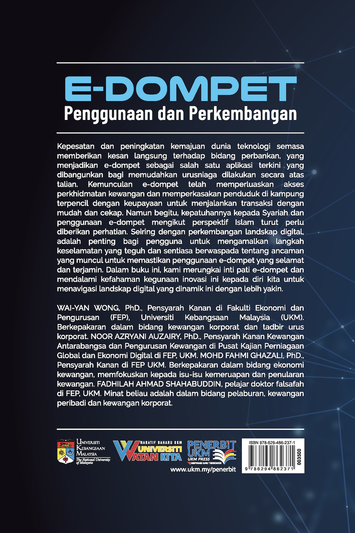 Kepesatan dan peningkatan kemajuan dunia teknologi semasa memberikan kesan langsung terhadap bidang perbankan, yang menjadikan e-dompet sebagai salah satu aplikasi terkini yang dibangunkan bagi memudahkan urusniaga dilakukan secara atas talian. Kemunculan e-dompet telah memperluaskan akses perkhidmatan kewangan dan memperkasakan penduduk di kampung terpencil dengan keupayaan untuk menjalankan transaksi dengan mudah dan cekap. Namun begitu, kepatuhannya kepada Syariah dan penggunaan e-dompet mengikut perspektif Islam turut perlu diberikan perhatian. Seiring dengan perkembangan landskap digital, adalah penting bagi pengguna untuk mengamalkan langkah keselamatan yang teguh dan sentiasa berwaspada tentang ancaman yang muncul untuk memastikan penggunaan e-dompet yang selamat dan terjamin. Buku ini merungkai inti pati e-dompet dan mendalami kefahaman kegunaan inovasi ini kepada diri kita untuk menavigasi landskap digital yang dinamik ini dengan lebih yakin.