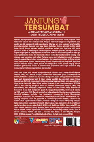 Penyakit jantung tersumbat berpunca dari penyempitan arteri koronari adalah penyebab utama kematian di seluruh dunia termasuklah di Malaysia. Pembunuh ‘senyap’ ini hanya dikenal pasti setelah pesakit mempunyai gejala yang ketara. Beberapa siri ujian saringan yang kompleks diperlukan sebelum diagnosis yang tepat dapat dijalankan. Justeru, alternatif melalui teknik bukan invasif dengan bantuan teknologi kecerdasan buatan amat diperlukan oleh pakar perubatan. Buku ini menerangkan secara terperinci mengenai penyakit jantung iskemik dan bagaimana pengelasan penyempitan arteri koronari dilakukan dengan menggunakan beberapa model pembelajaran mesin dari sistem kecerdasan buatan berdasarkan isyarat fisiologi yang dirakam pada permukaan kulit sahaja. Matlamat utama buku ini adalah memupuk kesedaran umum kepada pembaca tentang pengetahuan asas dan kepentingan menjaga kesihatan jantung selain menunjukkan potensi elektrokardiogram dan fotopletismogram yang boleh digunakan sebagai alternatif mudah, berkos rendah dan menjimatkan masa. Sistem lengkap dengan kebolehan pemantauan kendiri ini membolehkan pengesanan awal dapat dilakukan bagi mengurangkan risiko serangan jantung dan kematian.