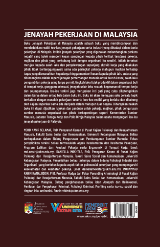 Buku Jenayah Pekerjaan di Malaysia adalah sebuah buku yang membincangkan dan mendedahkan realiti kes-kes jenayah pekerjaan serta industri yang dihadapi dalam dunia pekerjaan di Malaysia. Istilah jenayah pekerjaan yang digunakan melambangkan perkara negatif yang boleh memberi kesan sampingan kepada pihak terlibat terutama pekerja, majikan dan pihak yang berhubung kait dengan organisasi itu sendiri. Istilah tersebut merujuk kepada salah laku dan penyelewengan sepanjang aktiviti kerja yang dilakukan pihak tidak bertanggungjawab sama ada peringkat pekerja mahupun majikan terhadap tugas yang diamanahkan kepadanya hingga memberi kesan kepada pihak lain, antara yang dibincangkan adalah seperti jenayah pemerdagangan manusia untuk buruh kasar, salah laku pengambilan pekerja asing tanpa permit, tingkah laku tidak produktif dalam organisasi, buli di tempat kerja, gangguan seksual, jenayah salah laku rasuah, keganasan di tempat kerja dan seumpamanya. Isu-isu terkini juga merupakan inti pati yang cuba diketengahkan dalam karya dalam setiap bab dalam buku ini. Buku ini akan mengupas satu persatu topik berkaitan dengan masalah pekerjaan beserta kes-kes realiti yang berlaku dan disokong oleh kajian imperikal sama ada daripada dalam mahupun luar negara. Diharapkan naskah buku ini dapat dijadikan rujukan dan panduan untuk pekerja, majikan, pihak pengurusan sumber manusia organisasi dan pihak berkepentingan seperti Kementerian Sumber Manusia, Jabatan Tenaga Kerja dan Polis Diraja Malaysia dalam usaha menangani isu-isu jenayah pekerjaan di Malaysia.
