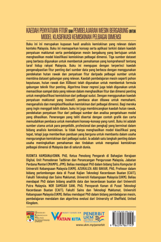 Buku ini ini merupakan kupasan hasil analisis kemiskinan yang relevan dalam konteks Malaysia. Buku ini memaparkan konsep serta aplikasi terkini dalam kaedah penyatuan maklumat serta pembelajaran mesin bergabung yang bertujuan untuk menghasilkan model klasifikasi kemiskinan pelbagai dimensi. Tiga sumber dataset yang berbeza digunakan untuk membentuk pemahaman yang komprehensif tentang taraf hidup rakyat Malaysia. Buku ini mengupas dengan terperinci kaedah pengenalpastian fitur penting dari sumber data yang berbeza dengan menggunakan pendekatan hutan rawak dan penyatuan fitur daripada pelbagai sumber untuk membina dataset gabungan yang relevan. Kaedah pembelajaran mesin seperti pohon keputusan, hutan rawak dan XGBoost telah digunakan untuk membentuk formula gabungan teknik fitur penting. Algoritma linear regresi juga telah digunakan untuk memastikan sampel data yang relevan dalam menghasilkan fitur dan dimensi penting untuk mengklasifikasi kemiskinan dari pelbagai sudut. Dengan menggunakan kaedah penyatuan maklumat yang inovatif, pembaca akan dibawa untuk memahami, menganalisis dan mengklasifikasikan kemiskinan dari pelbagai dimensi. Bagi mereka yang ingin menggali lebih dalam, buku ini juga membincangkan kaedah hutan rawak, pendekatan penyatuan fitur dari pelbagai sumber dan analisa pengetahuan model yang dihasilkan. Penerangan yang teliti disertai dengan contoh grafik dan carta memudahkan pembaca untuk memahami konsep-konsep yang rumit. Buku ini adalah sumber utama untuk para penyelidik, profesional dan pengkaji yang berminat dalam bidang analisis kemiskinan. Ia tidak hanya menghasilkan model klasifikasi yang tepat, tetapi juga memberikan panduan yang berguna untuk membantu dalam usaha mengurangkan kemiskinan dari pelbagai sudut. Ia adalah satu langkah penting dalam usaha meningkatkan pemahaman dan tindakan untuk mengatasi kemiskinan pelbagai dimensi di Malaysia dan di seluruh dunia.