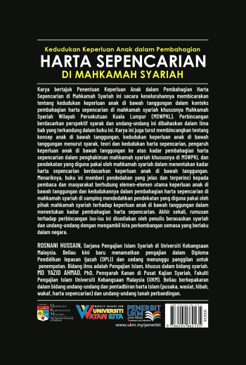 Karya ini secara keseluruhannya membicarakan tentang kedudukan keperluan anak di bawah tanggungan dalam konteks pembahagian harta sepencarian di mahkamah syariah khususnya Mahkamah Syariah Wilayah Persekutuan Kuala Lumpur (MSWPKL). Perbincangan berdasarkan perspektif syarak dan undang-undang ini dibahaskan dalam lima bab yang terkandung dalam buku ini. Karya ini juga turut membincangkan tentang konsep anak di bawah tanggungan, kedudukan keperluan anak di bawah tanggungan menurut syarak, teori dan kedudukan harta sepencarian, pengaruh keperluan anak di bawah tanggungan ke atas kadar pembahagian harta sepencarian dalam penghakiman mahkamah syariah khususnya di MSWPKL dan pendekatan yang diguna pakai oleh mahkamah syariah dalam menentukan kadar harta sepencarian berdasarkan keperluan anak di bawah tanggungan. Menariknya, buku ini memberi pendedahan yang jelas dan terperinci kepada pembaca dan masyarakat berhubung elemen-elemen utama keperluan anak di bawah tanggungan dan kedudukannya dalam pembahagian harta sepencarian di mahkamah syariah di samping mendedahkan pendekatan yang diguna pakai oleh pihak mahkamah syariah terhadap keperluan anak di bawah tanggungan dalam menentukan kadar pembahagian harta sepencarian. Akhir sekali, rumusan terhadap perbincangan isu-isu ini disediakan oleh penulis berasaskan syariah dan undang-undang dengan mengambil kira perkembangan semasa yang berlaku dalam negara.