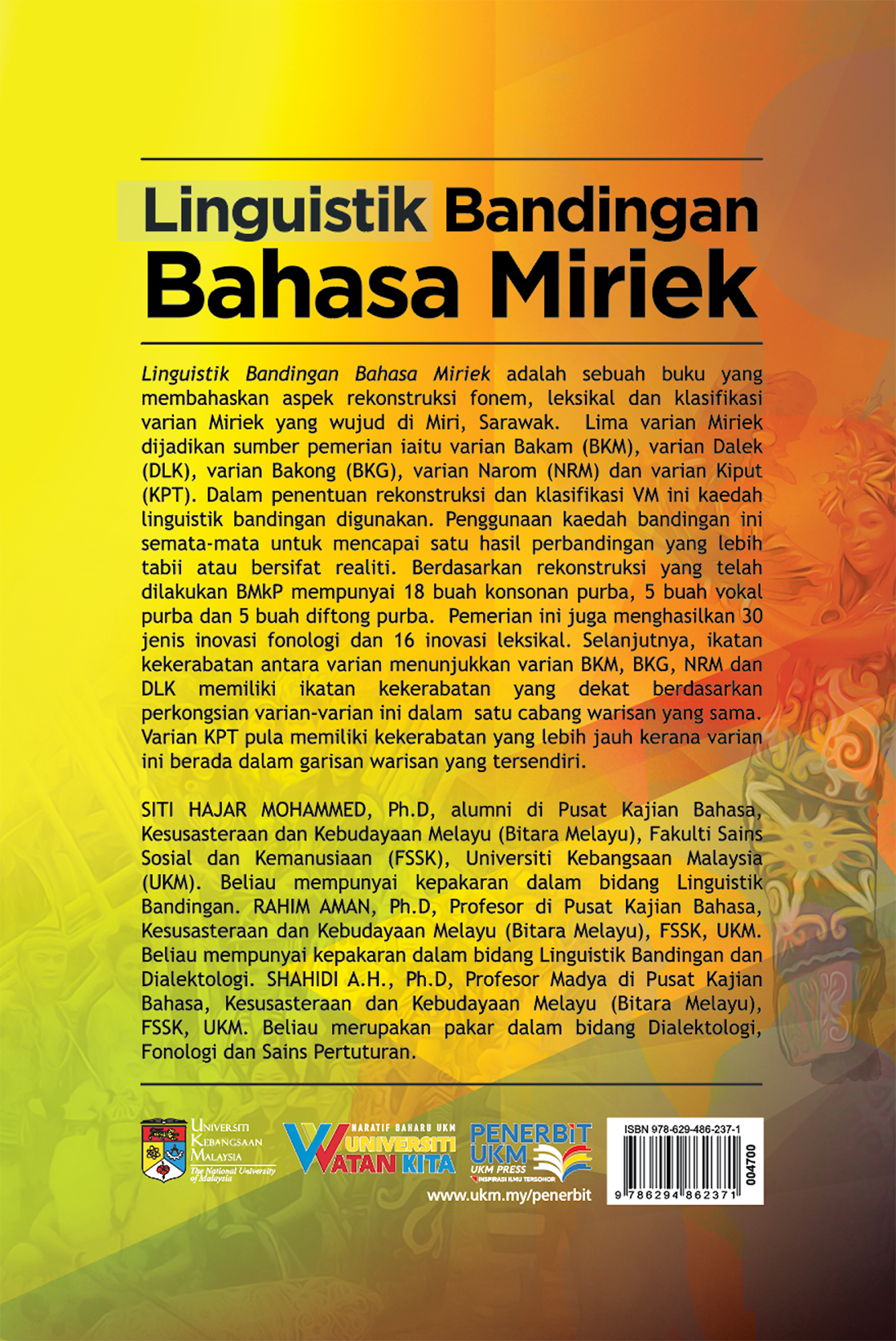 This book discusses aspects of phonemic reconstruction, lexical analysis and the classification of Miriek variants that exist in Miri, Sarawak. Five Miriek variants are used as the basis of the description: the Bakam (BKM) variant, the Dalek (DLK) variant, the Bakong (BKG) variant, the Narom (NRM) variant and the Kiput (KPT) variant. In determining the reconstruction and classification of these variants, the comparative linguistic method is used. The use of this comparative method is solely to achieve a comparison that is more natural or reflects reality. Based on the reconstruction that has been carried out, Proto-Miriek (BMkP) has 18 proto-consonants, 5 proto-vowels and 5 proto-diphthongs. This description also produces 30 types of phonological innovations and 16 lexical innovations. Furthermore, the kinship relationship between the variants shows that BKM, BKG, NRM and DLK have a close kinship relationship based on the shared heritage branch of these variants. Meanwhile, the KPT variant has a more distant kinship because it belongs to its own heritage line.
