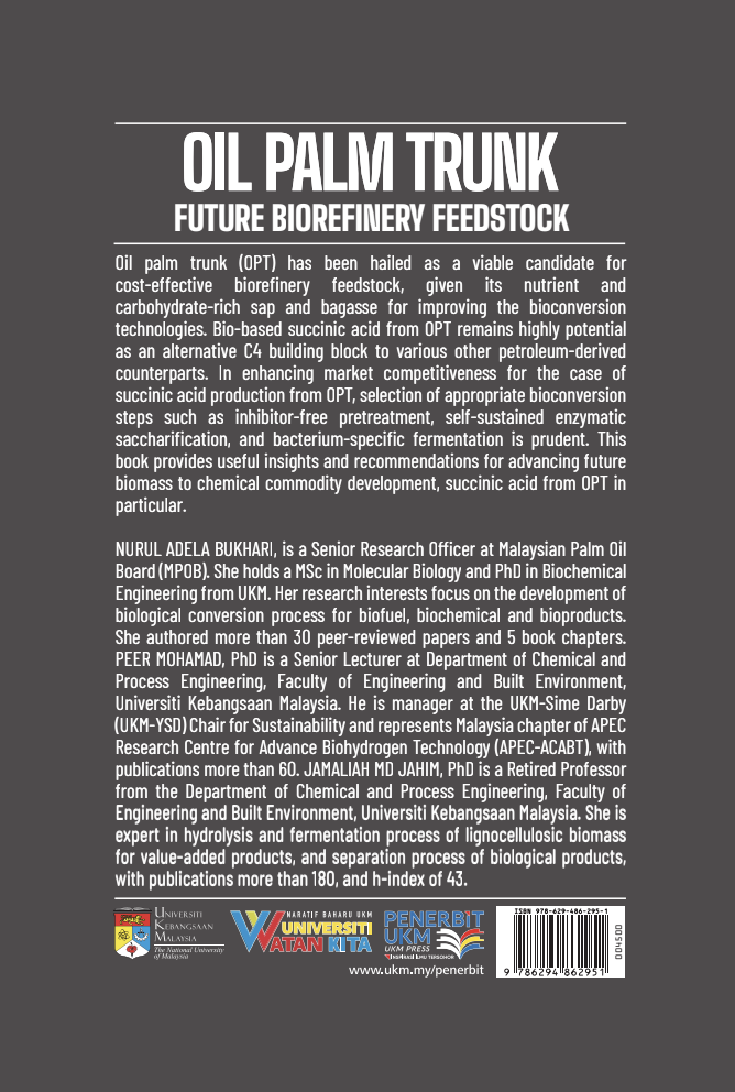 Oil palm trunk (OPT) has been hailed as a viable candidate for cost-effective biorefinery feedstock, given its nutrient- and carbohydrate-rich sap and bagasse for improving the bioconversion technologies. Bio-based succinic acid from OPT remains highly potential as an alternative C4 building block to various other petroleum-derived counterparts. In enhancing market competitiveness for the case of succinic acid production from OPT, selection of appropriate bioconversion steps such as inhibitor-free pretreatment, self-sustained enzymatic saccharification, and bacterium-specific fermentation is prudent. This book provides useful insights and recommendations for advancing future biomass to chemical commodity development, succinic acid from OPT in particular.