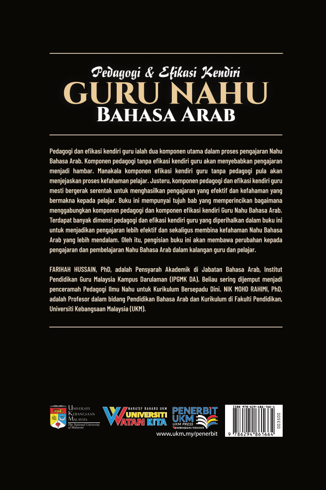 Pedagogi dan efikasi kendiri guru ialah dua komponen utama dalam proses pengajaran Nahu Bahasa Arab. Komponen pedagogi tanpa efikasi kendiri guru akan menyebabkan pengajaran menjadi hambar. Manakala komponen efikasi kendiri guru tanpa pedagogi pula akan menjejaskan proses kefahaman pelajar. Justeru, komponen pedagogi dan efikasi kendiri guru mesti bergerak serentak untuk menghasilkan pengajaran yang efektif dan kefahaman yang bermakna kepada pelajar. Buku ini mempunyai tujuh bab yang memperincikan bagaimana menggabungkan komponen pedagogi dan komponen efikasi kendiri Guru Nahu Bahasa Arab. Terdapat banyak dimensi pedagogi dan efikasi kendiri guru yang diperihalkan dalam buku ini untuk menjadikan pengajaran lebih efektif dan sekaligus membina kefahaman Nahu Bahasa Arab yang lebih mendalam. Oleh itu, pengisian buku ini akan membawa perubahan kepada pengajaran dan pembelajaran Nahu Bahasa Arab dalam kalangan guru dan pelajar.