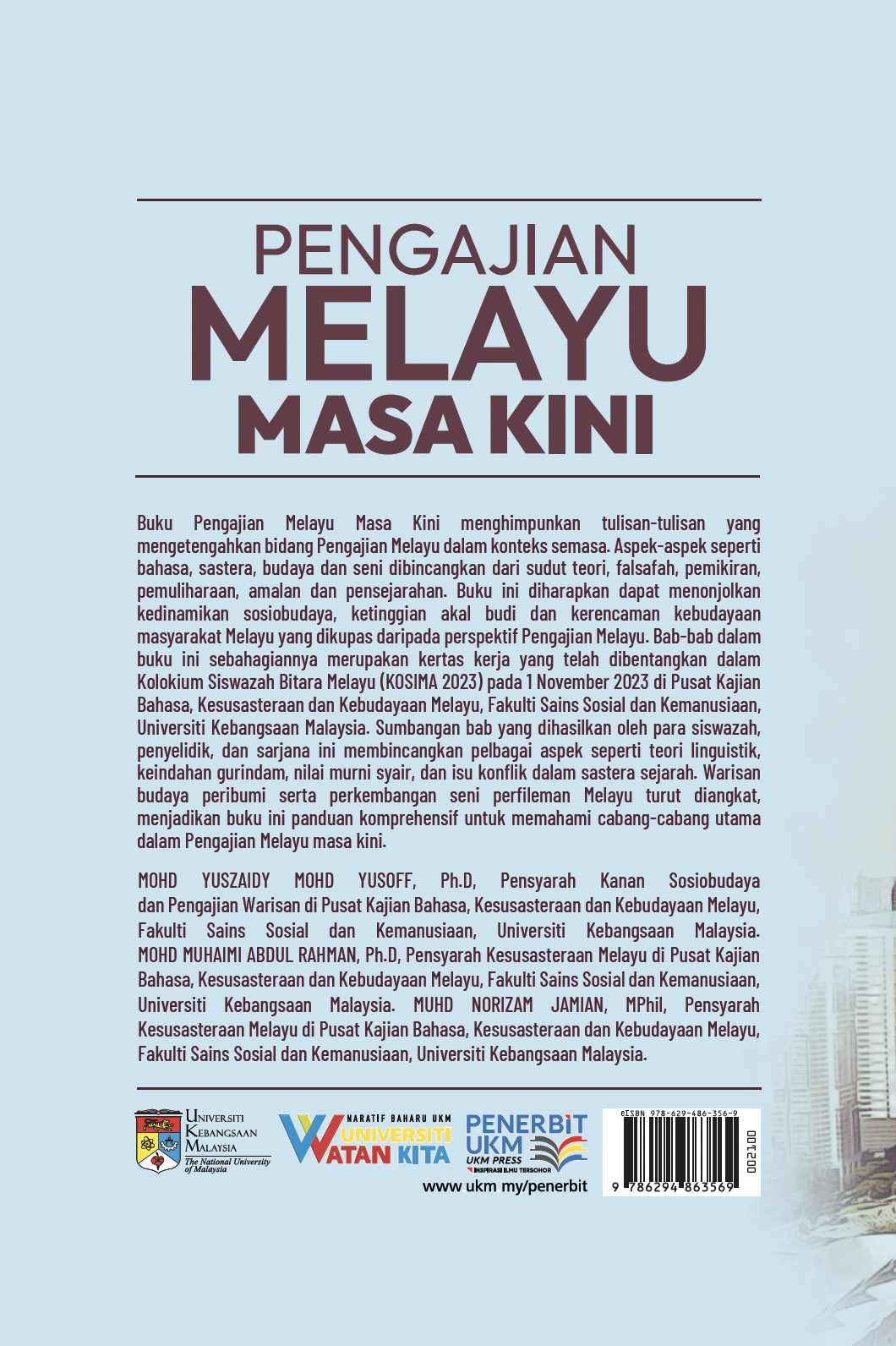 This book compiles writings that explore the field of Malay Studies in a modern scholarly framework. It examines various aspects, including language, literature, culture, and the arts, through theoretical, philosophical, intellectual, conservation, practical and historical perspectives. This book aims to highlight the sociocultural dynamism, intellectual depth and cultural diversity of the Malay community as studied through the lens of Malay Studies. Several chapters in this book are adapted from research papers presented at the Bitara Melayu Graduate Colloquium (KOSIMA 2023), held on 1 November 2023 at the Centre for the Study of Malay Language, Literature and Culture, Faculty of Social Sciences and Humanities, Universiti Kebangsaan Malaysia. Contributions from postgraduate students, researchers, and scholars explore a range of topics, including linguistic theory, the beauty of gurindam, the moral values embedded in syair and conflict issues in historical literature. The discussion also extends to indigenous cultural heritage and the evolution of Malay cinema, making this book a comprehensive reference for understanding the key dimensions of Malay Studies today.