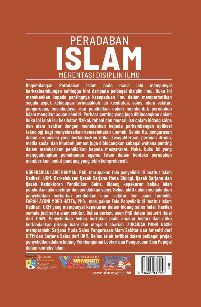 The greatness of Islamic civilisation in the past has had continuity until today across various disciplines of knowledge. This book emphasises the importance of the integration of knowledge in addressing all aspects of life, including health issues, science, the environment, management, socio-culture and education, in shaping Islamic civilisation according to its own model. An important issue also discussed in this book is the matter of physical, spiritual and mental health, issues in the fields of science and the environment, with an emphasis on the development of technological applications to solve the welfare of the ummah. In addition, management in organisations based on ethics, well-being, the role of drama, social media and Friday sermons are also discussed as important mediums in providing education to society. Thus, this book, which combines the understanding of Islam in the context of civilisation, provides a more comprehensive perspective.