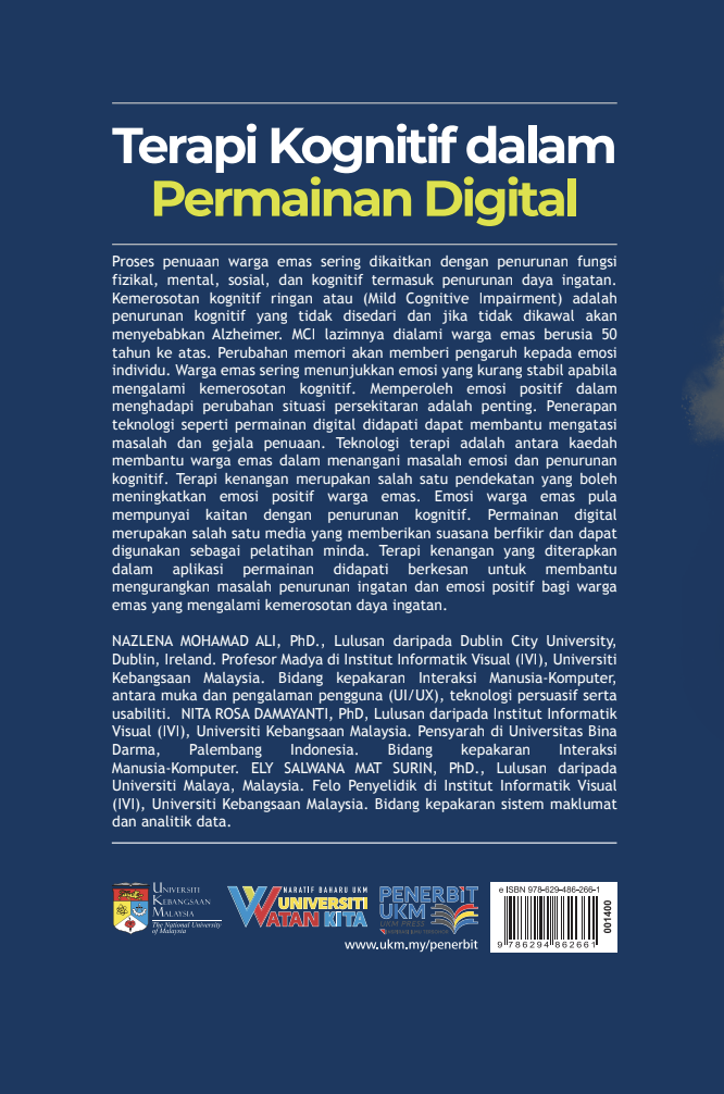 Proses penuaan warga emas sering dikaitkan dengan penurunan fungsi fizikal, mental, sosial, dan kognitif termasuk penurunan daya ingatan. Kemerosotan kognitif ringan atau (Mild Cognitive Impairment) adalah penurunan kognitif yang tidak disedari dan jika tidak dikawal akan menyebabkan Alzheimer. MCI lazimnya dialami warga emas berusia 50 tahun ke atas. Perubahan memori akan memberi pengaruh kepada emosi individu. Warga emas sering menunjukkan emosi yang kurang stabil apabila mengalami kemerosotan kognitif. Memperoleh emosi positif dalam menghadapi perubahan situasi persekitaran adalah penting. Penerapan teknologi seperti permainan digital didapati dapat membantu mengatasi masalah dan gejala penuaan. Teknologi terapi adalah antara kaedah membantu warga emas dalam menangani masalah emosi dan penurunan kognitif. Terapi kenangan merupakan salah satu pendekatan yang boleh meningkatkan emosi positif warga emas. Emosi warga emas pula mempunyai kaitan dengan penurunan kognitif. Permainan digital merupakan salah satu media yang memberikan suasana berfikir dan dapat digunakan sebagai pelatihan minda. Terapi kenangan yang diterapkan dalam aplikasi permainan didapati berkesan untuk membantu mengurangkan masalah penurunan ingatan dan emosi positif bagi warga emas yang mengalami kemerosotan daya ingatan.