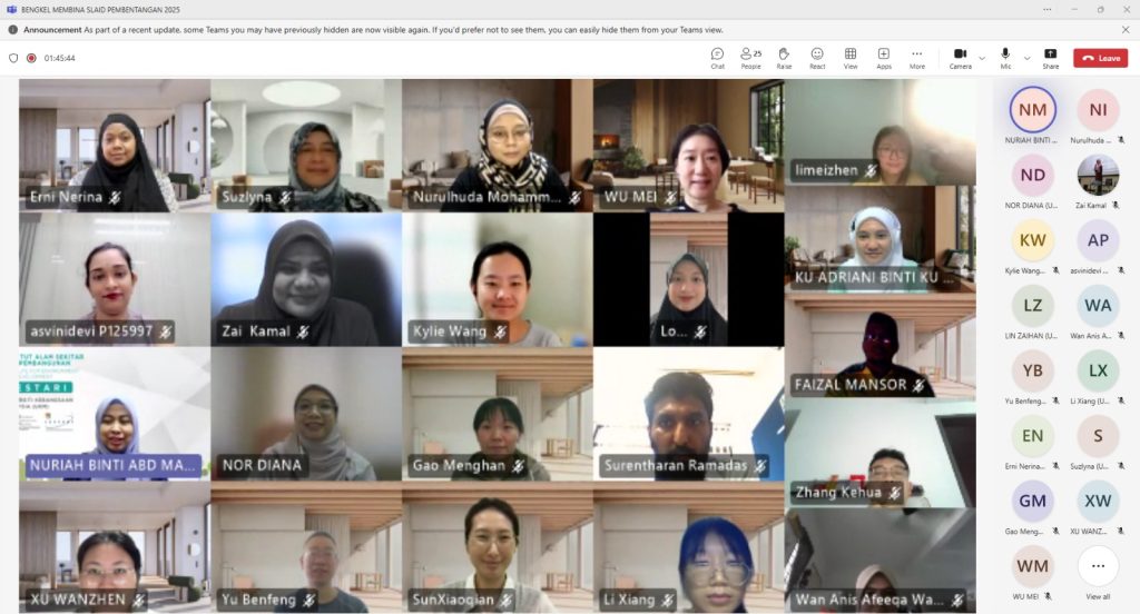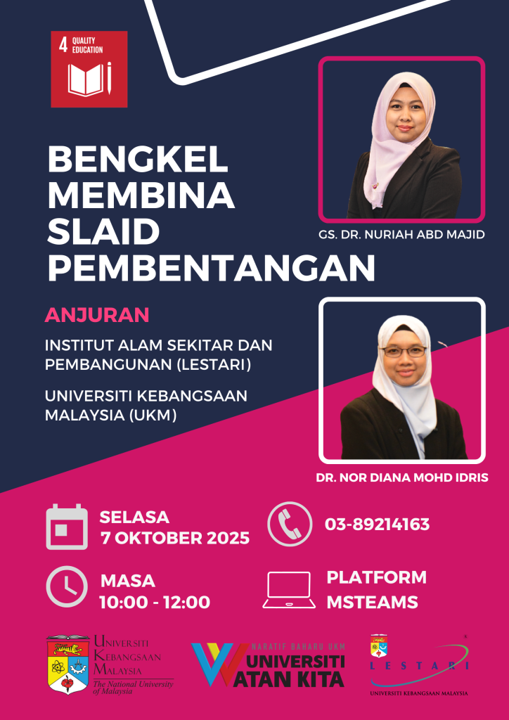 Institut Alam Sekitar dan Pembangunan (LESTARI), Universiti Kebangsaan Malaysia (UKM) telah menganjurkan Bengkel Membina Slaid Pembentangan secara dalam talian melalui platform Microsoft Teams, bermula jam 10.00 pagi hingga 12.00 tengah hari. Seramai 30 orang peserta terdiri daripada pelajar siswazah telah menyertai bengkel ini dengan penuh semangat.