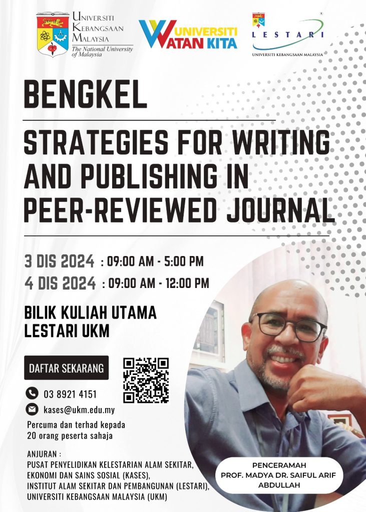 Bengkel Strategies for Writing and Publishing in Peer-Reviewed Journal anjuran Pusat Penyelidikan Kelestarian Alam Sekitar, Ekonomi dan Sosial (KASES) telah berjaya diadakan selama dua hari bermula dari 3hb hingga 4hb Disember 2024 bertempat di Bilik Kuliah Utama LESTARI dan dikendalikan sepenuhnya oleh Prof. Madya Dr. Saiful Arif Abdullah, Felo Kanan LESTARI.
