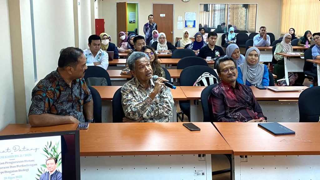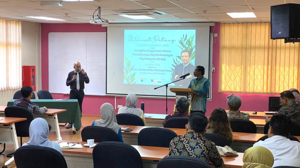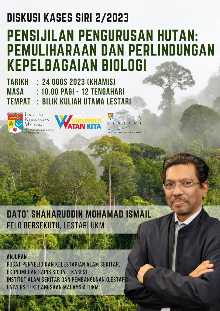 Diskusi 2/2023 telah berjaya disampaikan oleh YBhg. Dato’ Shaharuddin bin Mohamad Ismail pada 24 Ogos 2023 bertajuk Pensijilan Pengurusan Hutan: Pemuliharaan dan Perlindungan Kepelbagaian Biologi. Diskusi ini diadakan di Bilik Kuliah Utama LESTARI bermula pada jam 10 pagi dan berakhir jam 12 tengahari ini dipengerusikan oleh Profesor Madya Dr. Saiful Arif Abdullah.