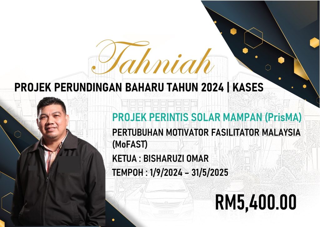 Tahniah juga diucapkan kepada Encik Bisharuzi Omar kerana memperolehi projek perundingan bernilai RM5,400.00 dari Pertubuhan Motivator Fasilitator Malaysia (MoFAST) bagi Projek Perintis Solar Mampan (PrisMA).