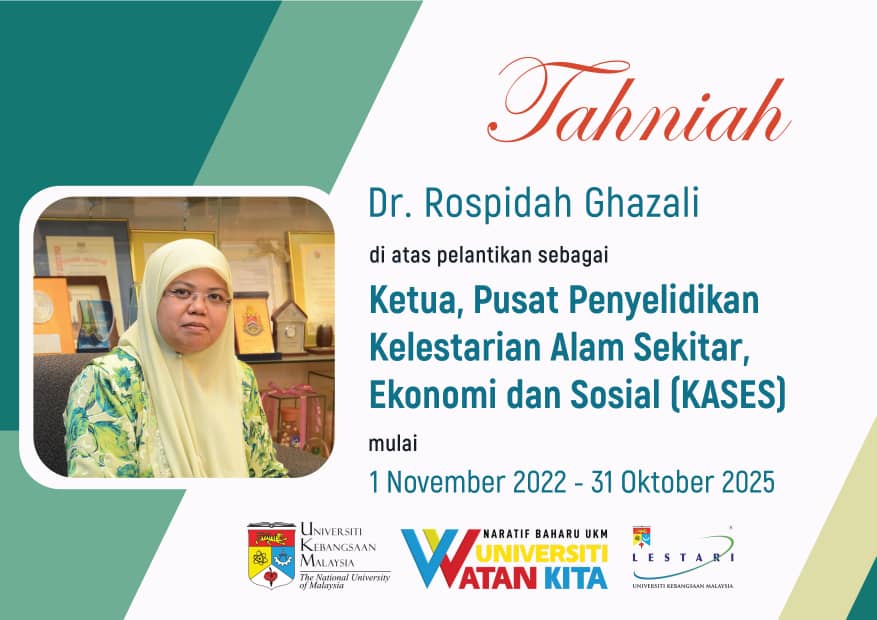 Sukacita dimaklumkan bahawa LESTARI ingin mengucapkan tahniah dan syabas kepada Dr. Rospidah binti Ghazali yang telah dilantik sebagai Pengerusi Pusat Penyelidikan Kelestarian Alam Sekitar, Ekonomi dan Sosial (KASES) LESTARI UKM untuk tempoh tiga tahun mulai 1 November 2022 hingga 31 Oktober 2025.