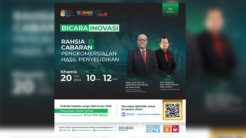 The Innovation & Technology Transfer Center (INOVASI@UKM™) would like to invite to the INNOVATION TALK 4/2024 program: SECRETS AND CHALLENGES OF COMMERCIALIZATION OF RESEARCH RESULTS.