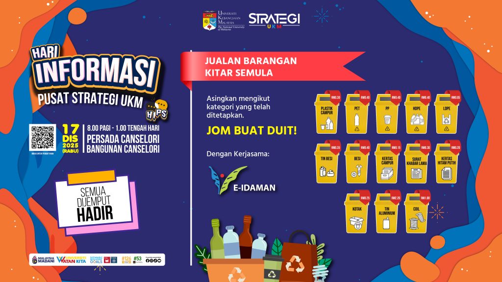 We are pleased to inform that the UKM Strategy Centre will be organizing a Recyclable Items Sale as one of the efforts to enhance sustainability awareness and waste management practices among the UKM community.