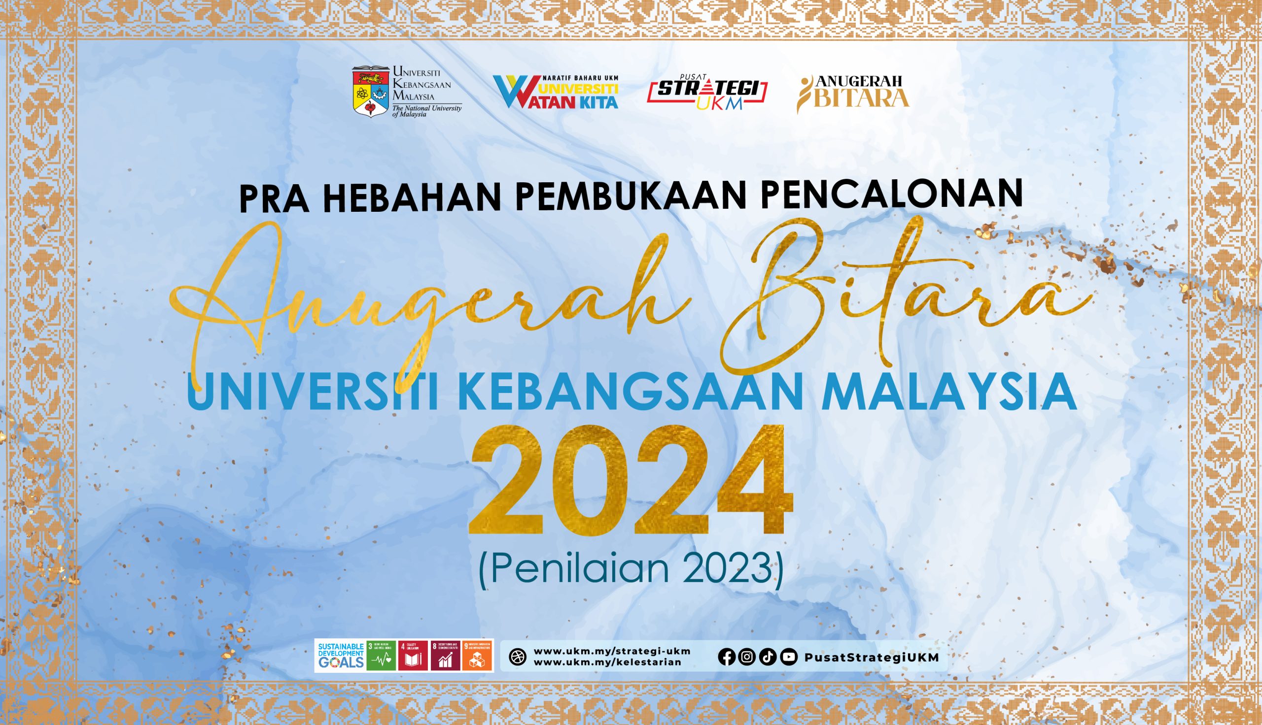 UKM’s Bitara Award is an annual program of the University that gives recognition to staff and Responsibility Centers (PTj) taking into account the achievement of quality performance in various aspects and fields. The UKM Strategy Center as the UKM Awards Secretariat, is pleased to invite YBhg. Prof. Ulung/Prof./Tan Sri/Datuk/ Dato’/Datin/Sir/Madam to send nominations for the UKM Bitara Award.