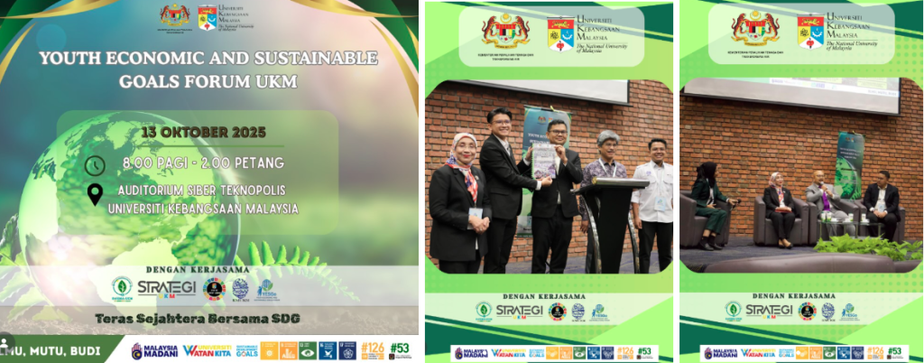 On 13th October 2025, UKM Malaysian Environment and Green Energy Association (EniGMA-UKM) had organized Youth Economic and Sustainable Goals Forum collaboration with UKM Strategy Centre, UKM International Strategic Negotiations and Sustainable Development Goals Center (UKM ISN SDG) and UKM Students’ Union (KMUKM). The program aims to explore ideas, opportunities, and the role of youth in realizing the nation’s sustainable economy. The forum session bringing together the voices of students, national leaders, industry players, and NGOs was successfully held at Universiti Kebangsaan Malaysia, featuring rich and meaningful discourse. Through multi-stakeholder perspectives, participants had the opportunity to discuss critical issues such as green economic development, climate change, employment opportunities, and the role of students in advancing the nation’s sustainability agenda.
