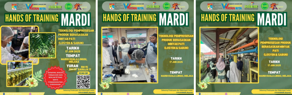On 17 June 2025, MyAgrosis Club UKM, in collaboration with MARDI Kuala Linggi and CESMED UKM, successfully organised the Essential Oil–Based Product Processing Technology Programme, held around the MARDI Kuala Linggi area and the aromatic site visit location. The programme provided early exposure to the essential oil industry and aimed to strengthen the entrepreneurial spirit among young agropreneurs.