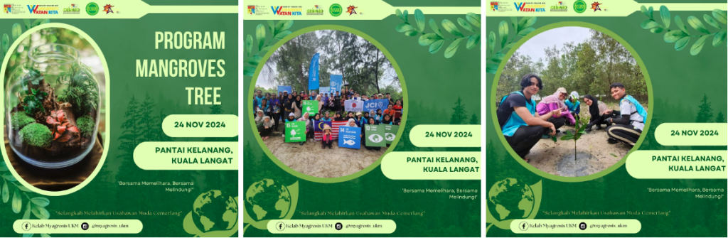 The Mangroves Tree 2024 programme, organised by Kelab Kufah in collaboration with Kelab MyAgrosis, was successfully carried out on 24 November 2024 at Pantai Kelanang, Kuala Langat. This joint initiative made a meaningful contribution to environmental conservation efforts by supporting the sustainability of mangrove ecosystems, while also fostering environmental awareness and responsibility among participants.