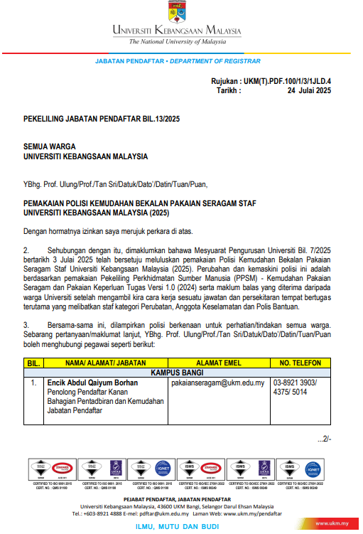 | 4 | Uniform Supply Facility Policy for Staff of Universiti Kebangsaan Malaysia (2025) | No. 13/2025 |