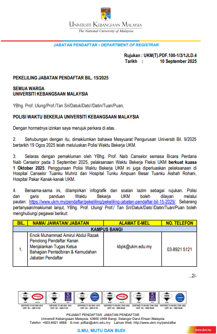 The University Board of Directors Meeting (LPU) approved Service Circular No. 15/2025: Implementation of Flexible Working Hours at UKM, which took effect on 1 October 2025 That provides guidelines and procedures for the adoption and management of flexible working hours for staff at Universiti Kebangsaan Malaysia.The circular aims to promote a more adaptable and efficient work environment by allowing staff to adjust their start and end times within specified limits, while ensuring that operational needs and service delivery are maintained. It outlines eligibility criteria, approval procedures, reporting requirements, and responsibilities of both supervisors and staff to ensure smooth implementation.