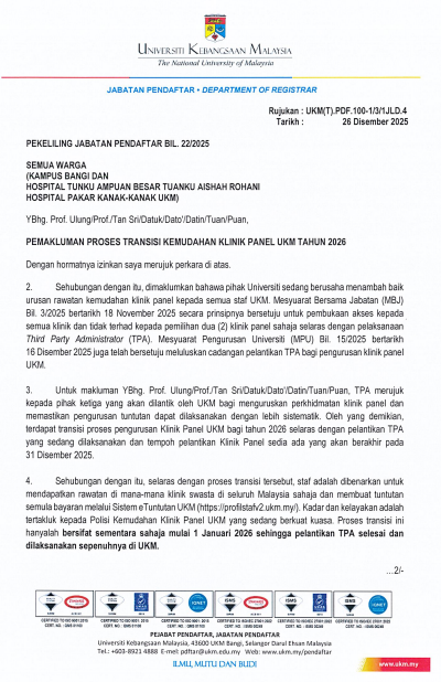 The University Board of Directors Meeting (LPU) approved Service Circular No. 22/2025: Notification on the Transition Process of UKM Panel Clinic Facilities for 2026 of UKM, which provides staff and stakeholders with detailed information regarding changes and updates to the university’s panel clinic services in the upcoming year. This notification outlines the procedures, timelines, and responsibilities involved in transitioning to the new or updated panel clinic arrangements, including any changes to healthcare providers, coverage, or administrative processes. It is intended to ensure a smooth and seamless shift, minimizing disruptions to staff access to medical services.