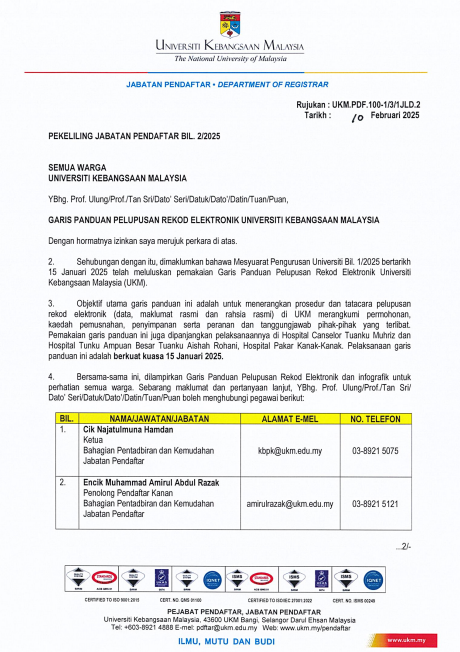 | 1 | Guidelines for the Disposal of Electronic Records of Universiti Kebangsaan Malaysia | No. 2/2025 |