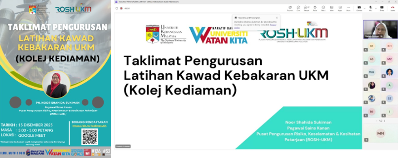 | 2 | UKM Fire Drill Management Briefing (Residential Colleges) https://www.facebook.com/share/p/1GEj2AriBP/ | 15 December 2025 | Online | Staff | 2 | SDG11 |