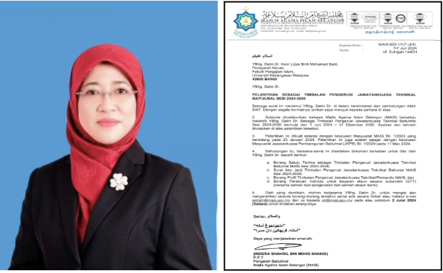 Datin Dr. Noor Lizza Mohamed Said is a lecturer at the Faculty of Islamic Studies. Her main area of expertise is Islamic Property Law, particularly in the aspects of Hibah (inter vivos gift), Wasiat (will), and Faraid (inheritance distribution). With her expertise, she has been appointed as Deputy Chairman of the Baitulmal Technical Committee by the Selangor Islamic Religious Council (MAIS). One of the functions of Baitulmal is to safeguard welfare, including contributing to economic development. Her role as Deputy Chairman of the Baitulmal Technical Committee is to recommend to the Baitulmal Development Committee any new policies related to Baitulmal, Zakat, and Wakaf, as well as directions for a more sustainable and dynamic Baitulmal.
