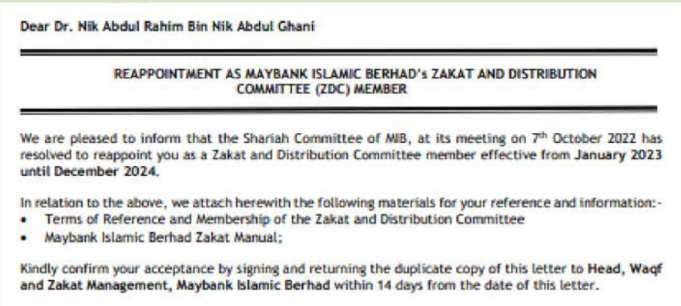 On 15 February 2024, he was appointed as a Member of the Federal Territories Islamic Religious Council (MAIWP) for a term until 14 February 2026. The Federal Territories Islamic Religious Council (MAIWP) is responsible for managing zakat through the collection and distribution of zakat funds to eligible asnaf, as well as implementing human capital and asset development programs to help asnaf break free from poverty. This includes providing housing, educational facilities, and skills training opportunities.