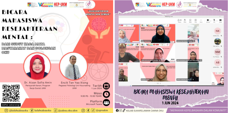 1 June 2024, UKM Cakna OKU Club UKM collaborated to successfully organize a program titled “Student Talk on Mental Well-Being: From the Perspective of Society and Persons with Disabilities (OKU)”, which was held online via Microsoft Teams. This program aimed to raise awareness about mental health issues from the perspective of OKU and society.