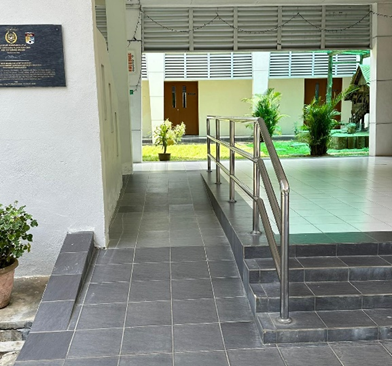 UKM has ensured that ramps and tactile pathways are installed in all major facilities, including faculties such as entrances to lecture halls, libraries, administrative buildings and the main mosque, allowing wheelchair users and individuals with visual impairments to navigate the campus easily. Tactile pathways are designed to help visually impaired individuals navigate the campus independently. These pathways consist of raised surfaces that provide directional cues when felt underfoot or with a cane. These tactile guides are placed strategically around campus, leading to important areas such as entrances to buildings, key walkways, elevators, restrooms.