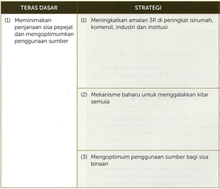 (Page:13): The image outlines part of the “Dasar Pengurusan Sisa Pepejal Negara 2016” (National Solid Waste Management Policy 2016) focusing on the core policy pillar (“Teras Dasar”) and its associated strategies followed by UKM. The main objective is to “Minimize solid waste generation and optimize resource usage.”