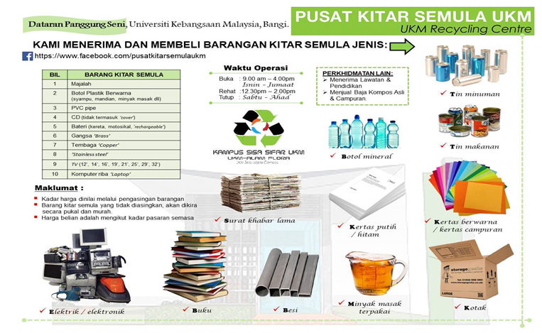 The sale and purchase catalog of recycled materials at the Recycle Center, UKM Bangi. This catalog serves as a resource for managing and tracking recyclable materials available for purchase, encouraging sustainable waste management on campus. It includes detailed listings of materials, pricing and availability, supporting UKM’s recycling initiatives and promoting a circular economy within the university community.