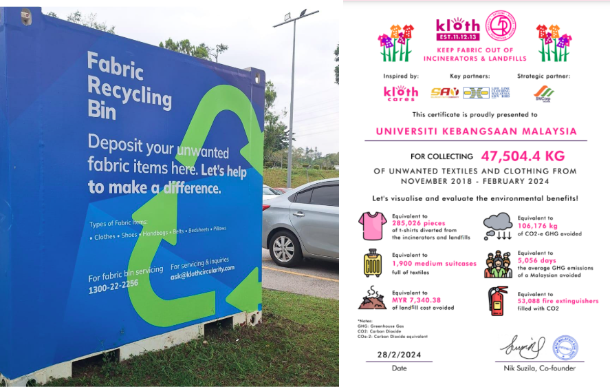 The Jom Fabrik recycling program aimed to educate the younger generation about the importance of recycling used fabrics while also being able to provide awareness to the community about the importance of recycling collaboration with Kloth Care. Kloth Cares is an environmental, economic, and social impact brand that aspires to become the catalyst of the textiles and clothing circular economy in Asia Pacific and Middle East. The highlight of this program was that citizens were invited to donate used fabrics into the donation bin. The fabric bin located in several location in UKM such as Mosque UKM.