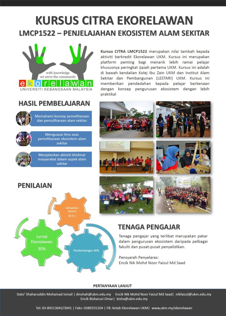 The LMCP1522 – Environmental ecosystem exploration course at Universiti Kebangsaan Malaysia (UKM) focuses on topics related to environmental science and management. Students will be exposed to activities related to the environment, especially recycling activities in residential areas. The course is open to all students at UKM Bangi for every semester.