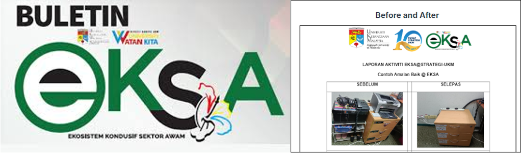 EKSA began to be implemented at UKM, Bangi in 2022 as a rebranding initiative for Public Sector 5S Practices taking into account the need to highlight a quality and conducive workplace environment at UKM. This rebranding step is thought to be appropriate and in line with the current changes and wishes to improve the performance and competitiveness of the organization in addition to invigorating the culture of creativity and innovation among the University’s people. One of the biggest objectives in EKSA is creating a conducive and sustainable university environment ecosystem.