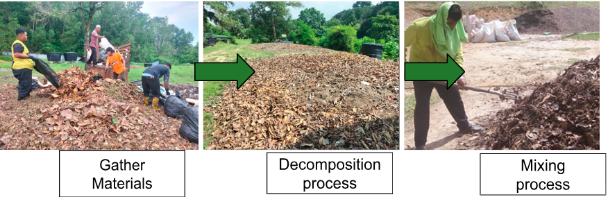 The composting process starts with gathering materials which are yard waste and food waste. The mixture will undergo a decomposition process that needs several conditions and moisture. Next, the workers will mix the mixture before undergoing the drying process. The composting process is shown below: