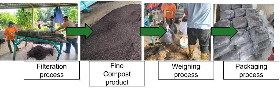 After the drying process, the composting product will undergo a rolling process to produce a fine size of natural fertilizer product as shown in Figure 3.5.12. Composting product from organic waste to be sold and used for landscape fertilizer at UKM Bangi.