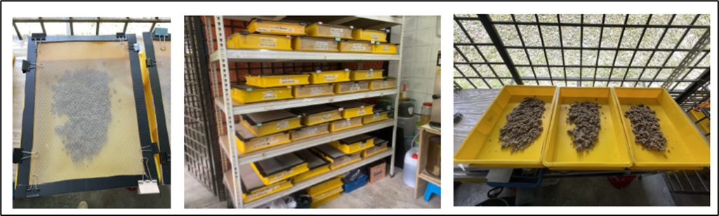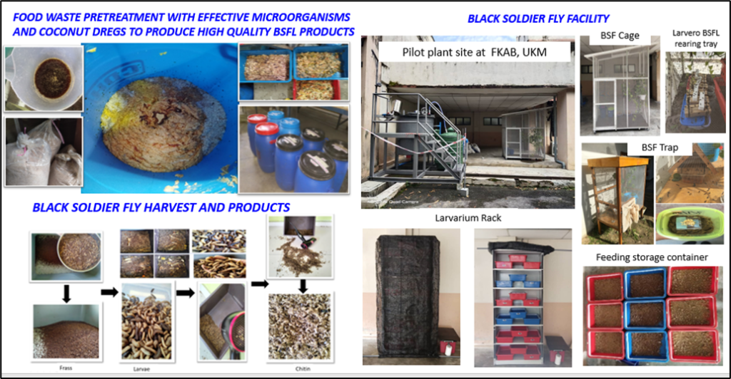 UKM is also working to produce animal feed, fertilizer, biodiesel and biogas through the farming of Black Soldier Fly (BSF). The Black Soldier Fly (BSF) technology at UKM, launched in 2019, represents a significant advancement in sustainable waste management. This initiative focuses on converting organic waste, particularly food waste, into valuable products. The project collects food waste daily from two main cafeterias: Kolej Kris Mas and Pendeta Za’ba sent to treatment. By utilizing BSF larvae, UKM effectively reduces the volume of food waste sent to landfills while generating high-value by-products that support its sustainability goals. The BSF bioconversion process involves collecting food waste, placing it in controlled environments with BSF larvae, and allowing the larvae to consume the organic material. Within 14 days, the mature larvae are harvested for use as sustainable animal feed and protein supplements in aquaculture. The remaining frass serves as nutrient-rich organic fertilizer, completing the recycling loop.