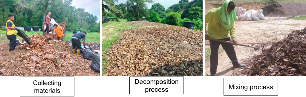 The composting process starts with gathering materials which are yard waste and food waste. The mixture will undergo a decomposition process that needs several conditions and moisture. Next, the workers will mix the mixture before undergoing the drying process. The composting process is shown in figure below.