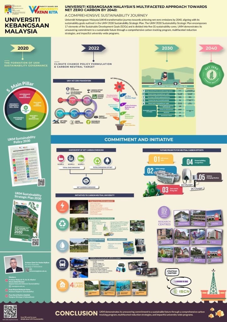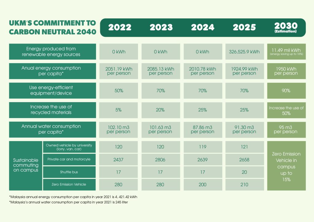 UKM’s progressive journey towards achieving net zero carbon emissions by 200, marked by significant milestones. In 2020, UKM initiated its commitment to sustainability by establishing a dedicated governance structure to oversee and guide its environmental efforts through UKM Sustainability Policy 2030 and UKM Sustainability Strategic Plan 2030. UKM Strategic Plan consists of 5 main pillars, which provide a strategic framework for achieving its ambitious environmental and social goals. The first pillar, Governance and Management, ensures that sustainability principles are embedded within UKM’s administrative structure and decision-making processes, promoting responsible leadership and accountability. The Sustainable Campus pillar focuses on transforming the physical environment of the university, fostering eco-friendly practices and infrastructure to reduce environmental impact. Through the Research and Innovation pillar, UKM encourages groundbreaking research that addresses climate change and environmental challenges, facilitating the development of sustainable technologies and solutions. The Teaching and Learning pillar underscores UKM’s commitment to educating students and staff on sustainability, integrating these topics into the curriculum to cultivate a culture of environmental consciousness. Lastly, University Well-being and Community emphasizes the university’s role in supporting the well-being of its students, faculty, and surrounding community, highlighting UKM’s dedication to social responsibility.