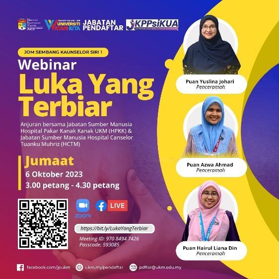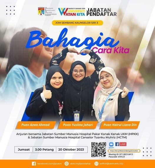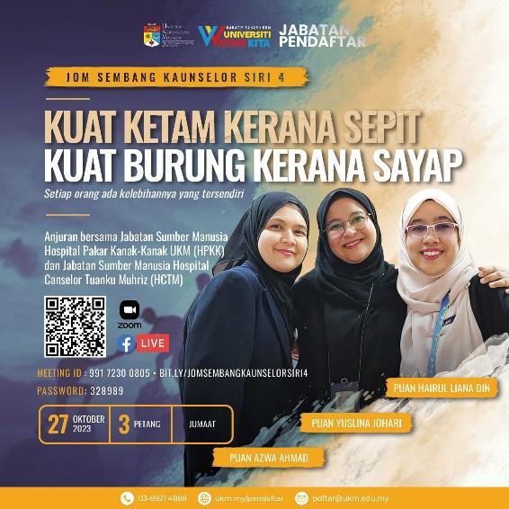 The Human Resources Division and Career Development Unit, UKM Registrar Department, in collaboration with the Human Resources Department of Hospital Canselor Tuanku Muhriz (HCTM) and the Human Resources Department of Hospital Tunku Ampuan Besar Tuanku Aishah Rohani-UKM Children’s Specialist Hospital (HPKK), organized the “Jom Sembang Kaunselor” Program in a series during October 2023 in conjunction with Counseling Month.