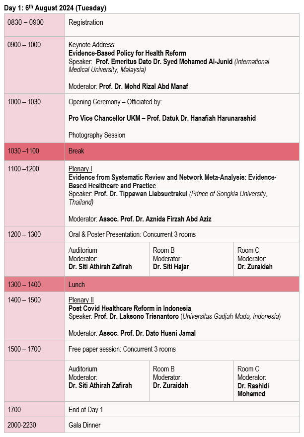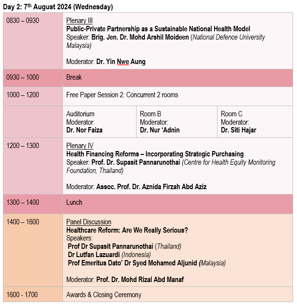 18th POSTGRADUATE FORUM ON HEALTH SYSTEMS AND POLICIES Hi and good day,We are delighted to invite you and your team to attend the “18th POSTGRADUATE FORUM ON HEALTH SYSTEMS AND POLICIES”. 📆Date: 6th & 7th AUGUST 2024 (Tuesday & Wednesday)⏰Time: 8.00 am – 6.00 pm🕹Venue: FACULTY OF MEDICINE, UNIVERSITI KEBANGSAAN MALAYSIA, CHERAS, KUALA LUMPURPARTICIPANT FEE: RM350 (Malaysian)USD100 (International)Register NOW;To register for ONSITE event:🔗 https://bit.ly/registrationPGF24To submit the abstract for ONSITE PRESENTATION due date on 30th June 2024:🔗 https://bit.ly/abstractPGF24To register for VIRTUAL event:🔗https://forms.gle/j1Ub1QaE5UXoTkydATo submit the abstract for VIRTUAL PRESENTATION due date on 8th July 2024:🔗https://tinyurl.com/PGF24HybridAbstractSubmission📍Please contact the organiser at pgfkl2024@gmail.com for more details about the forum.📍We look forward your participation in this forum. See you there. 18th Postgraduate Forum on Health Systems & Policies: Evidence-based Policy for Healthcare Reform. PROGRAMME Click here to download PGF18th 2024 PROGRAMME 06-07 AUGUST 2024